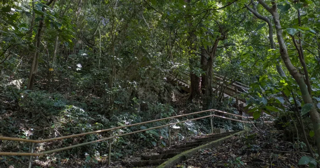汗を拭いながら長い階段を降りて、見上げるとそこからは登りです。ここから末吉宮へ!ヤシの森が、広がっています。